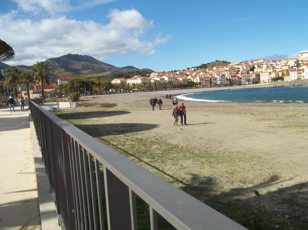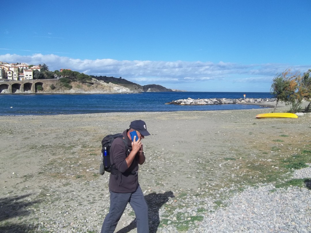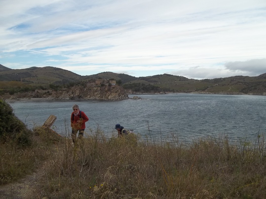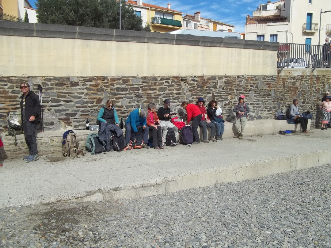 Poursuite sur le chemin du littoral pour atteindre le cap Castel de Vello qui permet d'avoir une vue sur la ville de Banyuls sur mer. Arrivée sur l'anse du Fontaulé au centre la ville pause repas sur le bord de la plage avec vue sur mer magnifique sous la surveillance d'un groupe de convives non invités qui n'ont pas manqué de réclamer des miettes. Après un bon partage de produits du terroir divers et variés le groupe a repris sa marche en avant en passant derrière le Laboratoire Arago pour rejoindre la route de Cerbère pendant quelques centaines de mètres avant de reprendre le sentier.