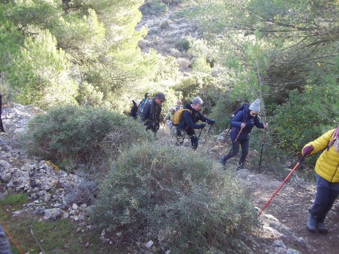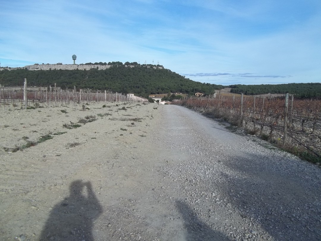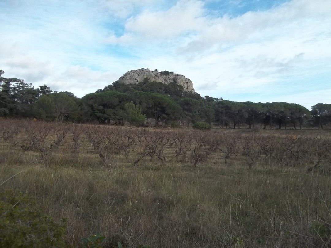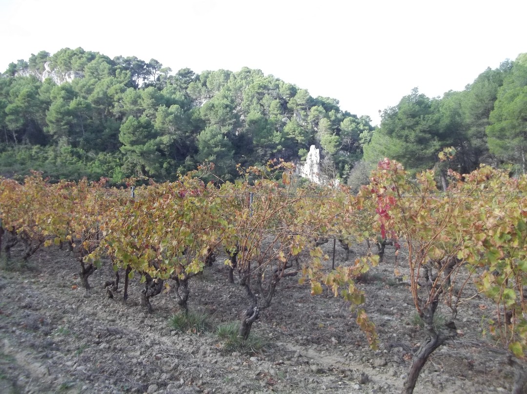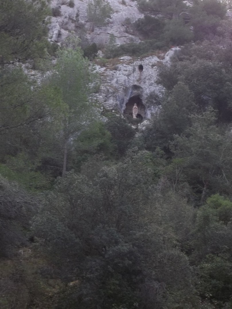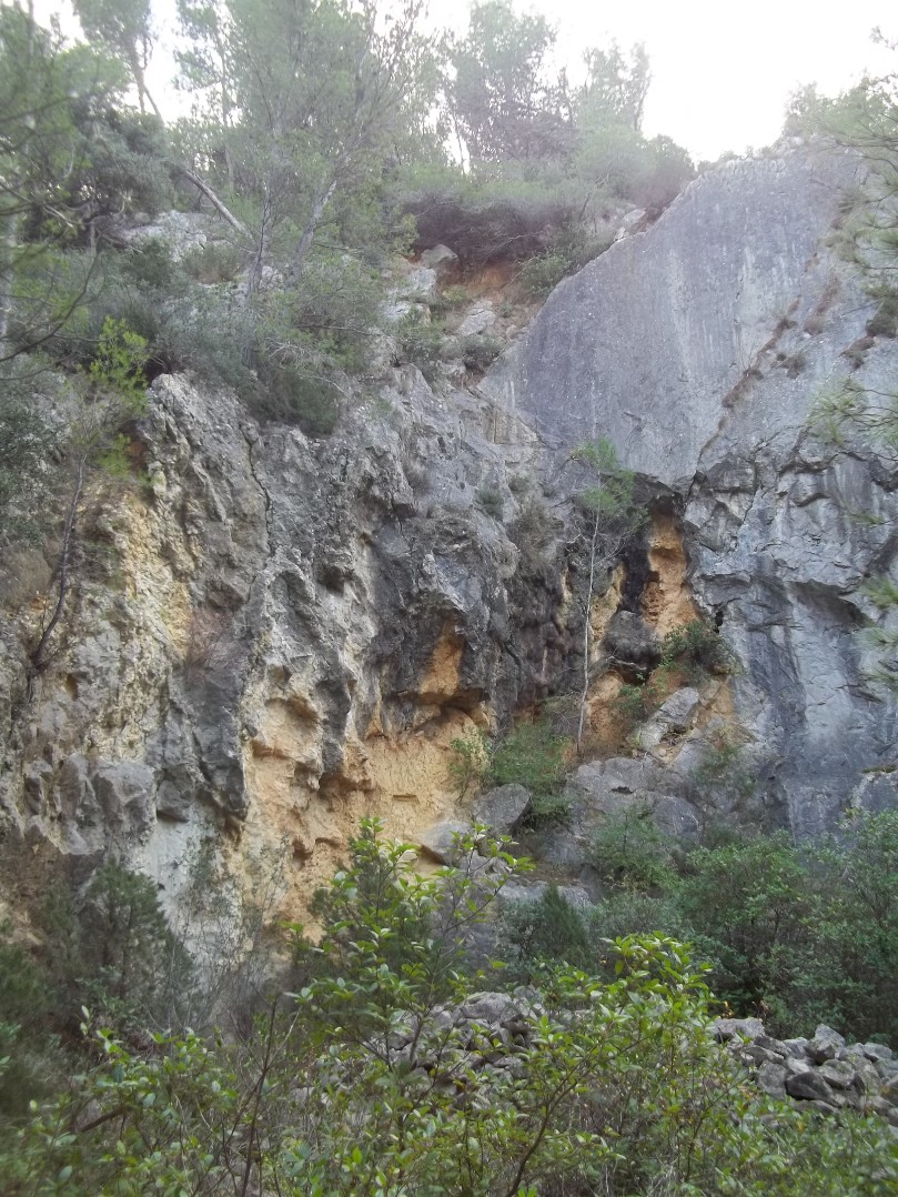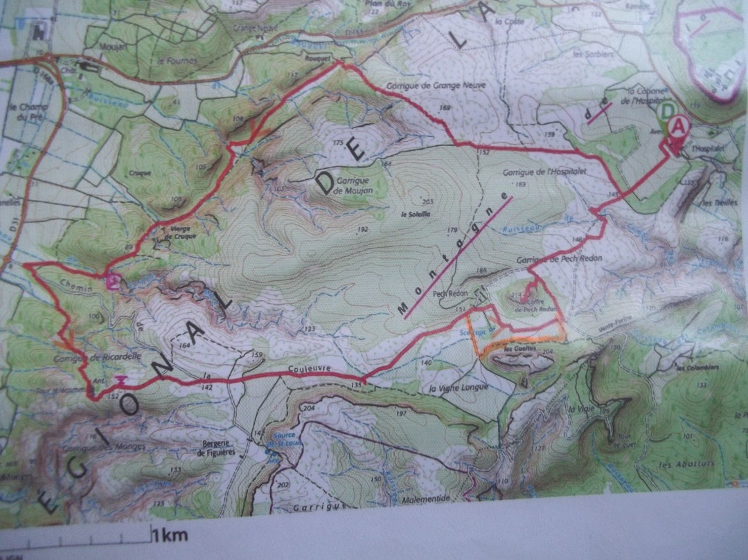 La première partie s'est faite le long des vignes du domaine et ensuite dans la garrigue de grange neuve afin d'atteindre le bord de la combe du Rouquet. La descente un peu technique à cause des pierres mouillées c'est faite sans difficulté. Le groupe à atteint le fond du ravin et a poursuivi par un chemin qui mène à la combe de la Cruque. Les parois rocheuses sont impressionnantes. Au bout de la draille traversant des sous bois se découvre un belle clairière. En regardant dans la paroi qui surplombe on peu voir dans une anfractuosité une statue de la vierge dite de Cruque.