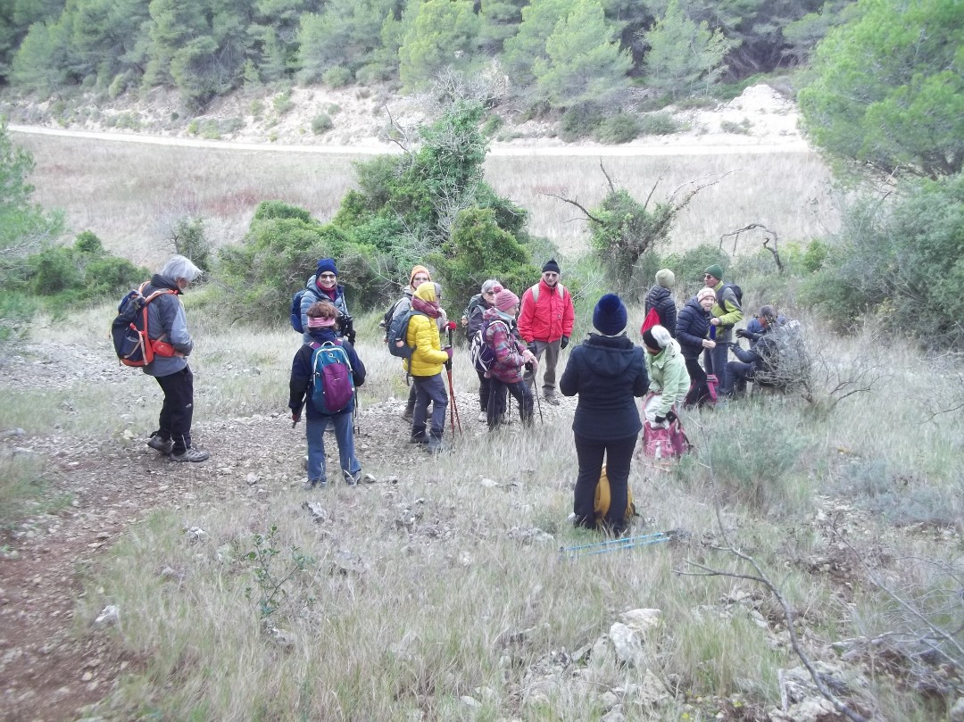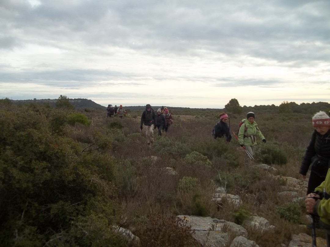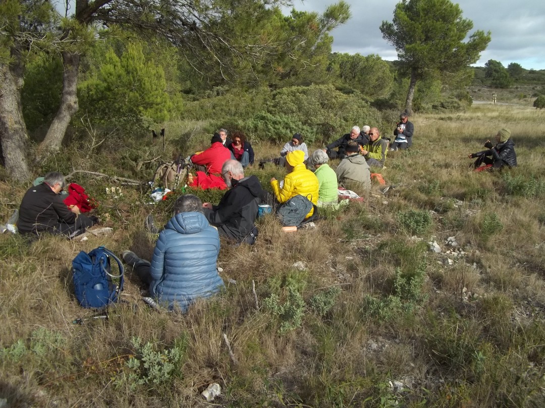 Ensuite il a été nécessaire de suivre un chemin montant pour passer au dessus de cette combe et redescendre en direction de la route de la couleouvre avant de remonter par une draille raide pour remonter sur le plateau. Après une petite recherche le groupe a trouvé une zone à l'abri du vent et exposé au soleil pour se restaurer. Comme d'habitude un échange de boissons et de gâteaux à animer le repas. Bien sur avant de repartir quelques blagues ont été racontées.
