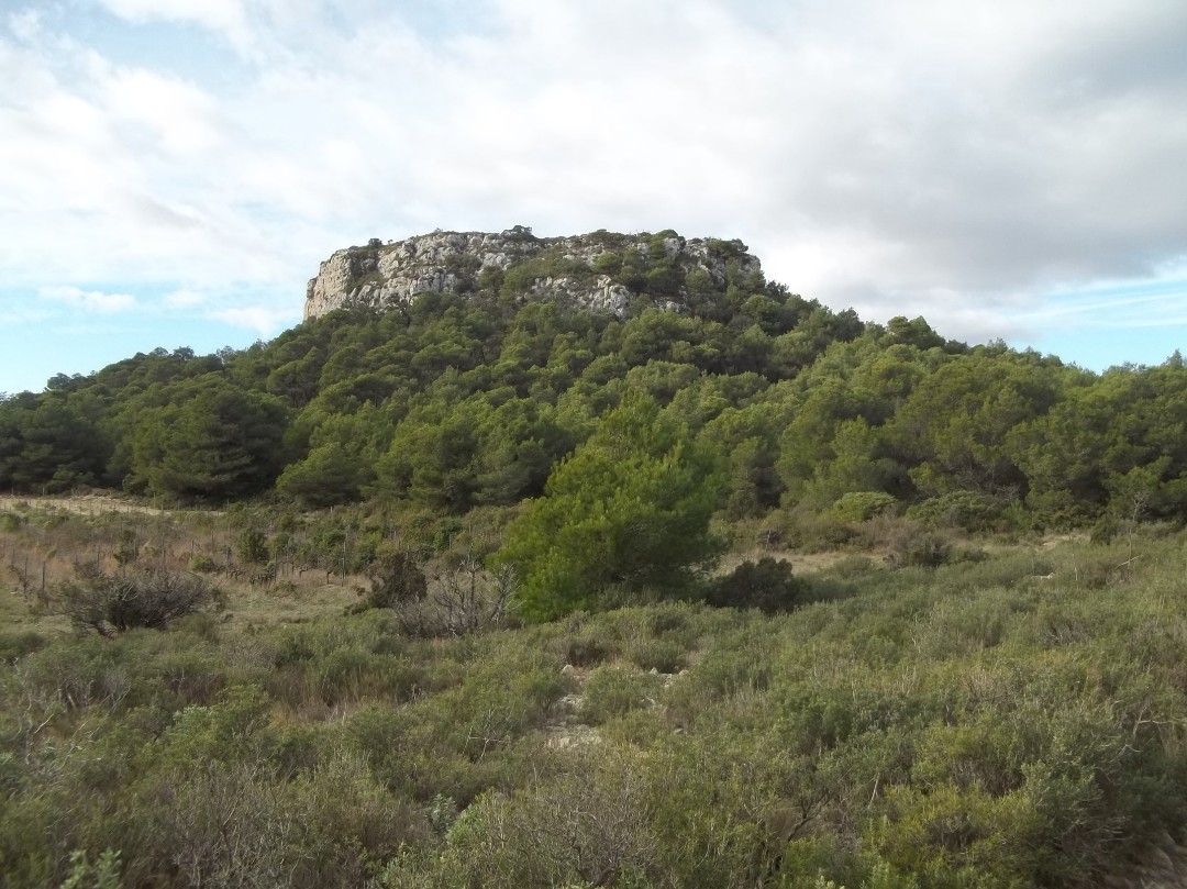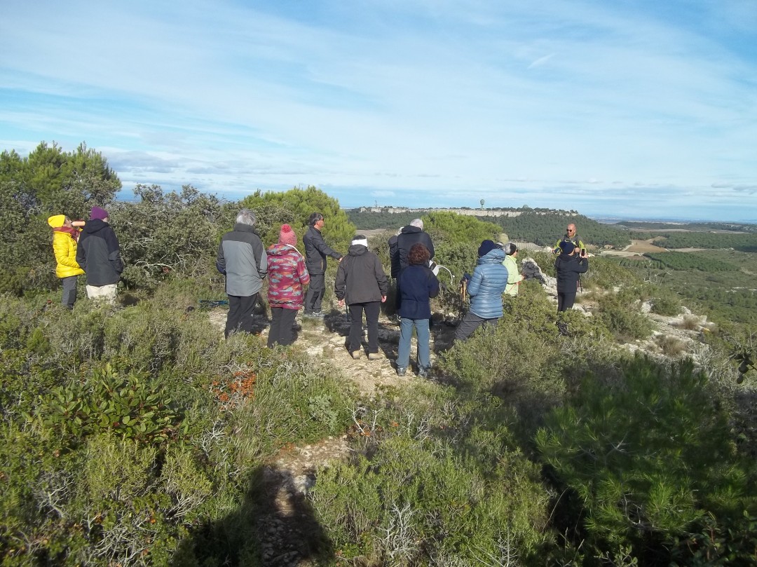 La randonnée s'est poursuivi sur un chemin goudronné pour atteindre le château du Pech Redan. Pour éviter la propriété privée le groupe a emprunté une draille longeant le mamelon des Cueltes. De la les randonneurs ont pu découvrir "le coffre du Pech Redan". Magnifique bloc rocheux émargeant au milieu de la plaine qui doit être grimpé. Du dénivelé de 140 mètres à la base le sommet à atteindre est à 214 mètres. La montée est particulièrement raide mais ne présente pas de grosse difficulté au coeur de la végétation. Arrivée au sommet la vue s'ouvre à 360 degrés. On peu y voir la côte du mont St clair jusqu'à l'Espagne, la chaîne des Pyrénèes et jusqu'au parc du haut languedoc.